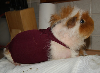 Weibi fing an, ständig zu brommseln und alle anderen zu besteigen. Ihre Gebärmutter war entzündet und musste rasch operiert werden. Gott sei dank glückte dieser Eingriff, was bei Meerschweinchen nicht selbstverständlich ist, da sie die Narkose nicht gut vertragen. Um zu verhindern, dass auch sie sich die Wunde aufbeißt, habe ich ihr einen Ganzkörper- body genäht. Sie hasste ihn, aber nach 2 Wochen war alles überstanden und sie verhielt sich wieder völlig normal. Die Herde atmete auf.